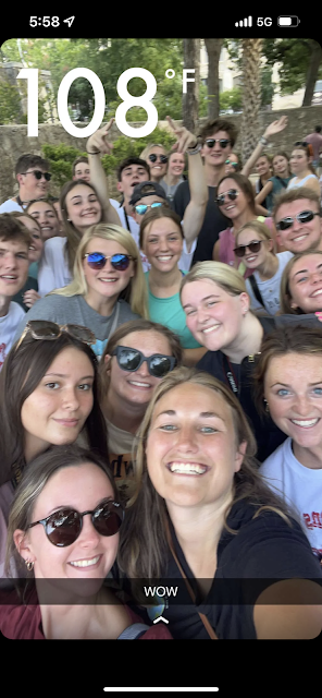 Yee-haw!! It’s the Bashfuls again, and it’s our final day of blogging! The boys were woken up this morning with pots and pans, while the girls got an empowering wakeup to “Run the World” by Beyonce! After a quick pack up in the early morning dark of Louisiana, we boarded the bus and set off. Brice tried his first yogurt ever when we had breakfast. For the first two hours, most were fast asleep, while others went to the front of the bus if they couldn’t sleep. Anticipation grew as we neared the largest Buc-ee’s in the world!!! Grant gave us a mile-by-mile countdown as we crossed into Texas and took in our new surroundings. Unfortunately, Ryan L. desperately had to go to the bathroom, yet we were far away from Buc-ee’s! With an astounding amount of perseverance and encouragement from his peers, he managed to hold it until he could sprint into Buc-ee’s! We had about twenty-five minutes to explore the glorious gas station. We shopped for shirts, snacks, Icees, and even swim trunks! Once we were out at the bus again, we heard of a slight dilemma coming from the van riders! While riding on the highway, the trailer wheel flew off! Luckily, everyone (including the van itself) is safe and sound. Shout out to Mr. Grant Deaton (aka Brad Pitt) for getting it fixed so quickly. It did make for a cramped bus ride though! The remainder of our ride to San Antonio was hot, sticky, and sweaty! It was 108 degrees outside, but our friendship helped us push through until we arrived. We speed-walked off of the bus through historic San Antonio until we reached the Alamo! We got to walk through and take in the history of this monument. Brice and the other counselors pulled a prank on us and told us we had to take off our shoes to walk down to the river walk to protect the porcelain floors. It is safe to say we all made a fool of ourselves and burnt our feet walking the long ways down to the river walk. We were set free to explore the city. Most people shopped, got ice cream, and took cool pictures. Once back on the bus, we had a delicious dinner of chicken caeser wraps, thanks to the Happys. We took in the rolling hills of Texas and had a quick Walmart stop. Hunter bought a Gilbert Barbie doll, and Randy bought everyone popsicles! We are so grateful for the friendships and memories we are making. We are now safely at our campsite for the night and getting ready for a hot and sweaty sleep.