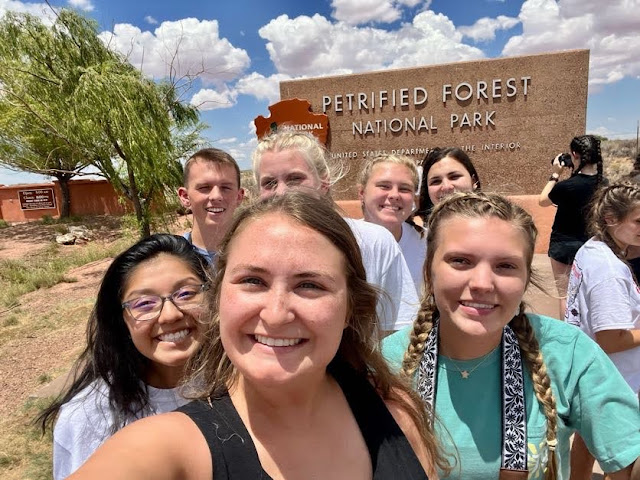 Today was a spectacular driving day as we loaded up the bus, after getting to sleep in this morning, and making our way to the big hole in the ground. For breakfast, we had a delicious and nutritious meal of cereal, juice, and bananas. On the bus we filled the time with some amazing karaoking. The songs ranged from Boyfriend to Fergalicious to Sweet Caroline and American Pie. These amazing performances included cameos from our fantastic bus driver, Randy, duets and trios alike, Hotel California from Elijah, and an unexpected reveal of talent from Patrick in American Pie. The van slept and had an emergency pit stop. For lunch, we had some refreshing ham or chicken sandwiches with carrots and ranch. After a few rest stops, we arrived at the Petrified Forest, where we had to lay a lucky smooch on some petrified wood. We then took a short drive to the lookout for the Painted Desert. After taking pictures, we listened to some lovely research on the state of Arizona and our two stops. We loaded back into the bus and van for a stop at Wal-Mart, where the coveted and rare share size pack of Fudge Brownie M&Ms were finally founded after days of no success. The group also bought snacks and supplies for our trek into the Grand Canyon tomorrow. The Grumpys served some delicious chicken salad sandwiches, grapes, pretzels, veggie straws, and Capri-suns. As we drove into the Grand Canyon, we saw many elk and Touristas. The bus enthusiastically researched and imitated elk sounds while entering the park. We headed to our campsite in Mather Campground, unpacked our bags, then started a 2 mile hike to an outlook over the Grand Canyon for the amazing sunset. We had some people cry, while others describe it as mesmerizing, inspiring, astonishing, and of course, big. We returned to our campsite for an early bedtime in preparation for our 4:30 hike tomorrow morning. Call you tomorrow!